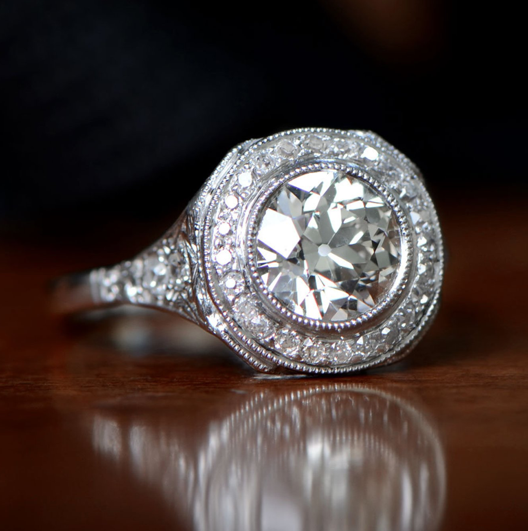 Rare Art Deco Diamond Halo Engagement Ring – 1.55 Carat – Handcrafted Platinum with Engravings – Circa 1920