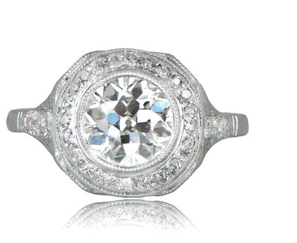 Rare Art Deco Diamond Halo Engagement Ring – 1.55 Carat – Handcrafted Platinum with Engravings – Circa 1920